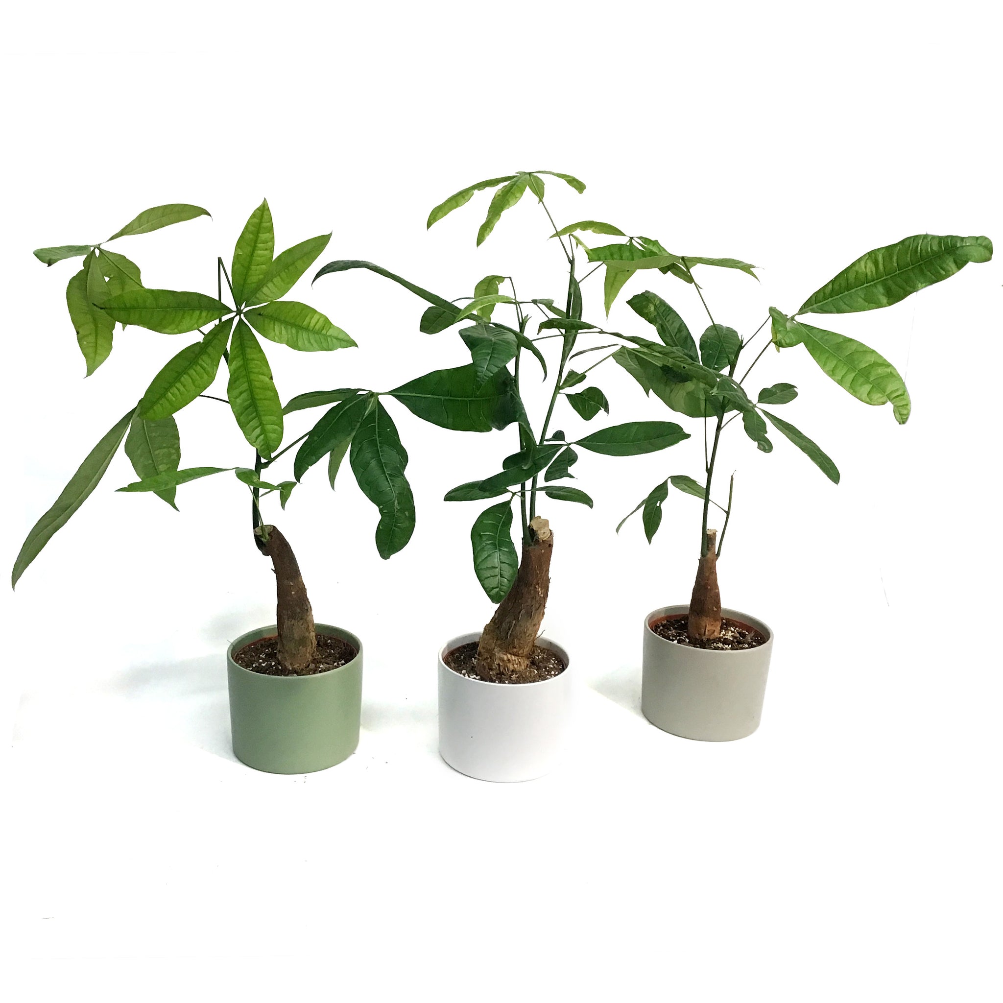 Money Trees are best known for their symbolism of bringing good fortune and good luck. Their brown woody trunks are often braided to create a unique tree trunk look. Emerging from the top of the trunks are very thin stems with hand-shaped compound leaves, consisting of up to 9 leaflets, in a deep green colour.