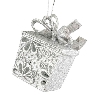 Silver Engraved Glitter Gift Box Ornament, 3.25in