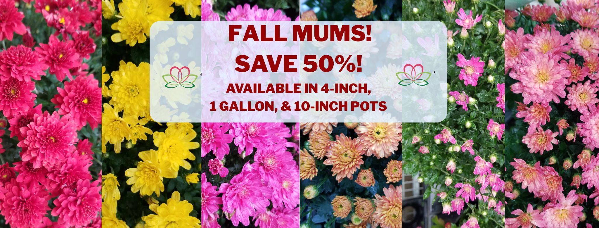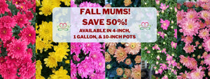 SAVE 50% ON 4 INCH, 1 GALLON AND 10 INCH POTTED MUMS!