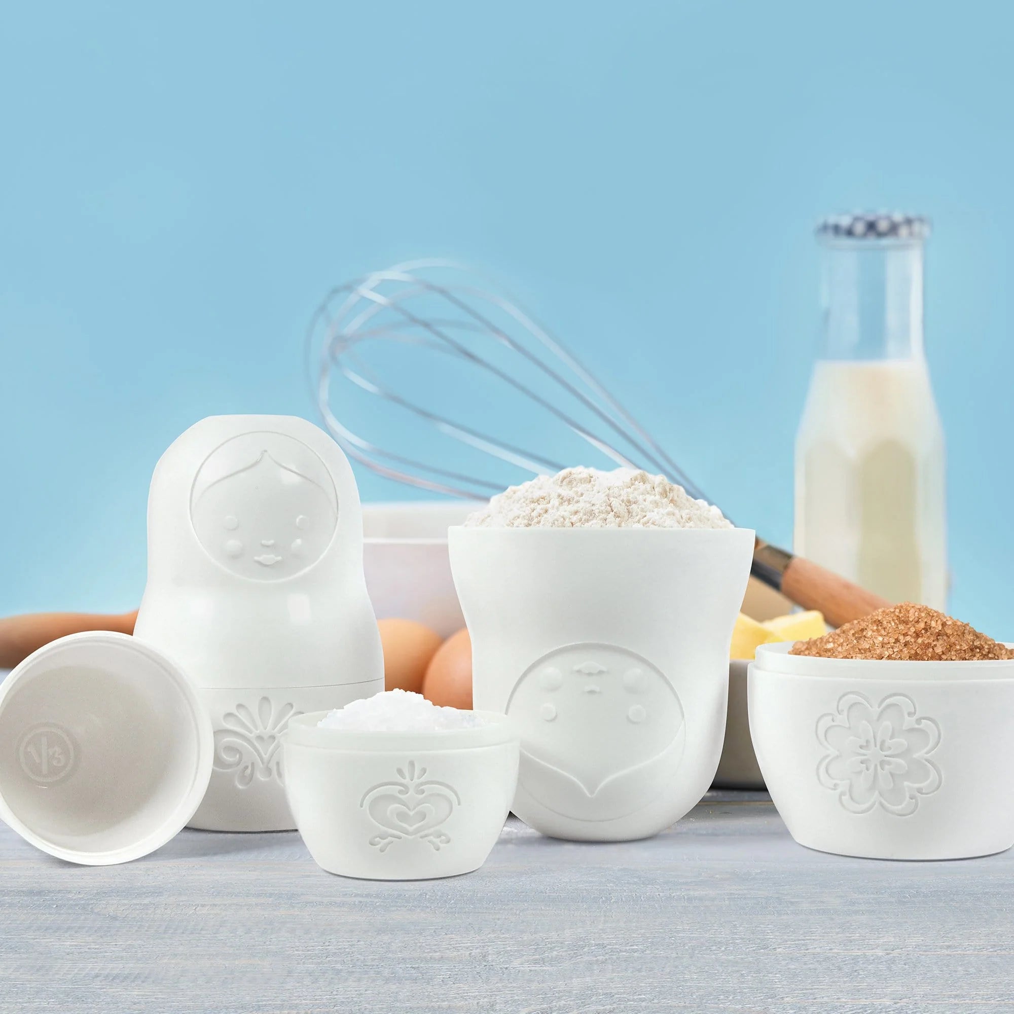 Matryoshkas made to measure. This set of six dry-measure cups nests neatly just like traditional Russian matryoshkas. They accurately measure 1/4, 1/3, 1/2, 2/3, 3/4 and 1 full cup, and they're built from heavy-duty, food-safe, long-life engineered plastics. M-Cups are useful, easy to store, and quite charming... so why not doll up YOUR kitchen with a little Russian folklore?